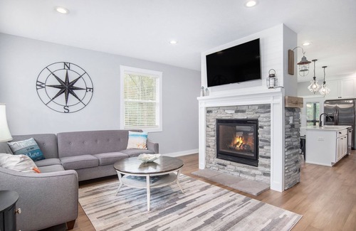 The upstairs has three bedrooms and two bathrooms and a living area. A large bedroom serves as a second floor master suite with an attached bathroom including a shower, toilet and sink. The spacious bunk room for all ages has four twin built in beds and a walk in closet full of toys! The living area on this floor is nautically themed with comfy overstuffed furniture and a large flatscreen to boot.