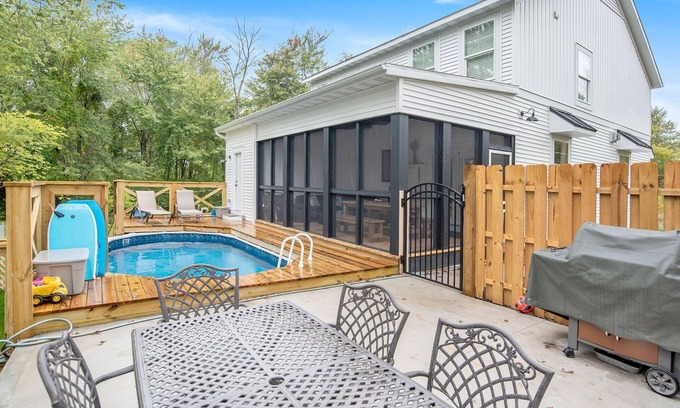 Oh and lets talk about the HEATED pool.....its not huge, 10Wx 21L x 52 inches deep but large enough for a lot fun water time. A deck surrounding the pool makes a great hang out area for your gathering and attached cement patio area with more seating and a Weber grill. The hot tub sits right outside of the master bathroom door to the deck. The hot tub and pool are about 10 feet apart and kids and adults can jump from one to the other. Steps down from the patio offers some backyard green space that is fenced in. Hanging out at the outdoor bar by the pool getting splashed by the kids never sounded so good! We keep the pool temperature at 85 degrees & no extra charges for the heat. Pool is open from May1st to October 15.