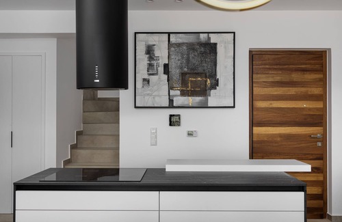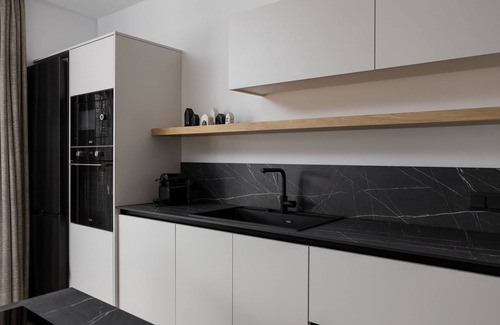 - Fully equipped kitchen with modern appliances and 2 bar stools at the kitchen island