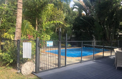 Outdoor dining and covered entertainment area with BBQ and table tennis. The swimming pool is heated to 30 degrees which is essential in winter, and receives plenty of shade from the surrounding tropical palms in summer.