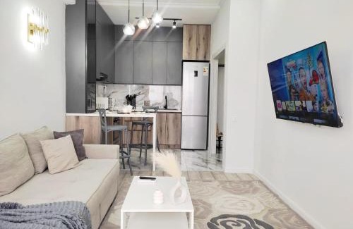 This apartment features air-conditioned accommodations with a balcony. With free Wifi, this 1-bedroom apartment provides a flat-screen TV, a washing machine, and a fully equipped kitchen with a microwave and fridge. Towels and bed linen are provided in the apartment. The accommodation is non-smoking. Almaty International Airport is 14 miles away.