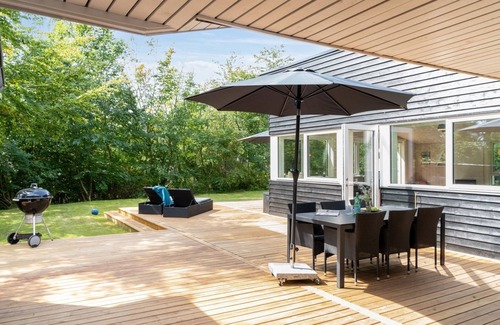 Single-family house, built in 2023. 1.1 km from the sea. Private: property 1'725 m2, well-kept garden. Outdoor shower, terrace (215 m2), barbecue, children's playground. In the house: trampoline, washing machine, tumble dryer. Parking at the house. E-charging station. Grocery 700 m. Golf course 2.6 km. The owner does not accept any youth groups.