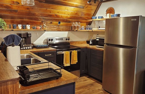 Hemlock & Sapphire is a secluded, adults-only cabin designed for couples who crave romance, relaxation, and a touch of luxury in the heart of nature. Tucked away in a quiet wooded setting near Cave Run Lake, this cozy one-bedroom retreat blends rustic charm with modern comforts. Inside, you’ll find thoughtful details like four fireplaces, a spacious two-person Jacuzzi tub, and a vintage record player for nights by the fire. Step outside to unwind in the covered hot tub, rinse off under the trees in the private outdoor shower, or share stories by the fire pit under the stars. With a fully equipped kitchen, fiber Wi‑Fi, and easy smart lock check-in, Hemlock & Sapphire makes slipping away together easy, whether you’re celebrating a special occasion or simply escaping the everyday. Just minutes from hiking trails, the lake, and local dining, this woodland hideaway is your private jewel for reconnecting and making lasting memories.