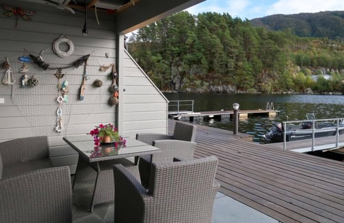 Certified fishing house "Heningen", 1 m a.s.l.. 14 houses in the resort. 2 apartments in the property. In the resort 1.5 km from the centre of Uggdal, 7 km from the centre of Våge, 54 km from the centre of Bergen, 1 km from the lake, 350 m from the beach, 5 m from the fijord. For shared use: volleyball court. Motor boat (on order), parking on the premises. Shop 1.5 km, bus stop "Uggdalseidet" 1.2 km, railway station "Bergen" 54 km, ferry "Bergen" 54 km. Owner lives in separate semi-detached house.