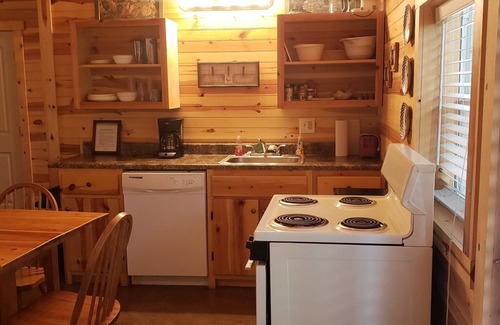 The interior of this quaint cabin features beautiful rustic pine with exposed metal ducts, comfortable furniture, central heat and air, full kitchen with oven, range, dishwasher, microwave, coffee maker, Washer and Dryer and full size refrigerator.