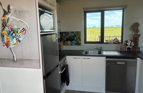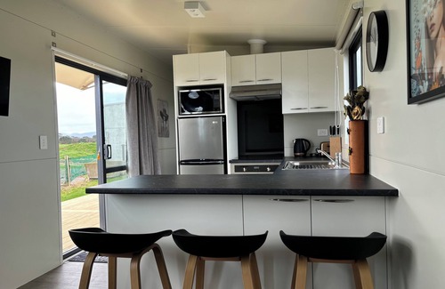 This funky little Home is situated next to Rustic decommissioned cow shed And there are views for miles.Has a trampoline for the kids or adults. It is on a working farm so at times farm machinery and Farm animal noises could be heard. Beach at the end of the road and five minute drive to Opunake and 40 minute drive to New Plymouth . The sections not secure and there's a creek over the fence.