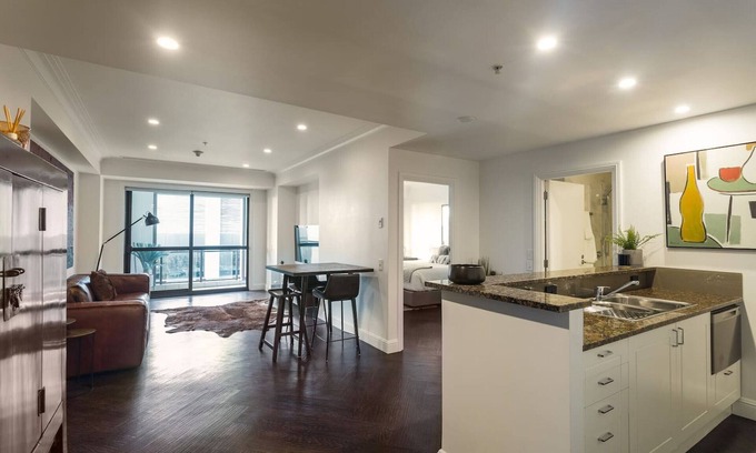This stylish 1-bedroom apartment has everything you need whether it's for a weekend getaway or a week long business trip. The open plan kitchen looks over the dining and lounge area and you can also sit on the balcony and be the unofficial umpire for a tennis match! The bedroom is just off the kitchen and features a generous king size bed and TV. Relax in the bath with a nice glass of bubbly and unwind from your busy day shopping. There is also a washer and dryer available.
