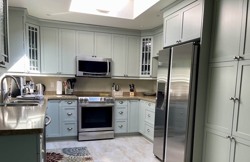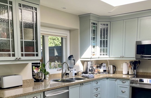 The kitchen is a cooking enthusiasts dream. It has granite counter tops, maple cabinets, stainless-steel appliances which includes: a state-of-the-art induction range with duel convection oven, fridge and freezer with filtered water and ice maker, high-end, silent dishwasher, built-in, multi-function convection microwave, coffee machine, regular drip coffee machine, Vitamix blender, high-end cookware, and so much more. There are loads of counter space for prep but be warned…. it is hard to focus because one area provides a beautiful view of the ocean and the other, the spectacular gardens and pond. The kitchen also provides a second eating area and has table for 6.