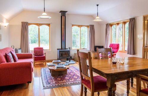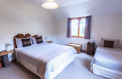The Wine Loft Cottage is up a flight of sandstone stairs and is privately situated at the bottom of the property and sleeps a maximum of six in two bedrooms. It is suited for two couples or for a family (children under two are not charged). The main bedroom has a queen bed, and two single beds can be set up, while the second bedroom has a queen bed. The beds have electric blankets to ensure you have a comfortable night. The cottage is spacious and has an open-plan kitchen, dining and lounge area. The bathroom has a shower and bath and there is a separate toilet. There is a washing machine in the bathroom. The cottage is private and peaceful and has lovely views across the D'entrecasteaux Channel to Bruny Island, as well as views of the rural property.