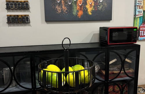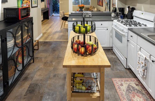 Avid cooks will love the fully-equipped kitchen, Weber BBQ, fresh herb garden, citrus trees, and indoor and outdoor dining tables. The kitchen is crafted for convenience. Cooks can prep food while catching up on their favorite TV shows. Appliances include an InstaPot, food processor, mixer, and high-speed blender. There are baking dishes, pots of all sizes, a wide array of cooking utensils, dried spices, and condiments.