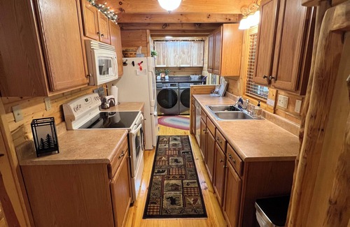 Our cabin features hand made log furniture that is out of this world. From your dining experience to your bedroom furniture, you will experience only the best in our home. Our down stairs bedroom features a king sized bed. Our upstairs bedroom has a queen. We have 2 full baths. Our spacious loft holds a queen log futon, a twin long trundle day bed and a twin log chair that makes into a bed for your extra family members. We can sleep 8!