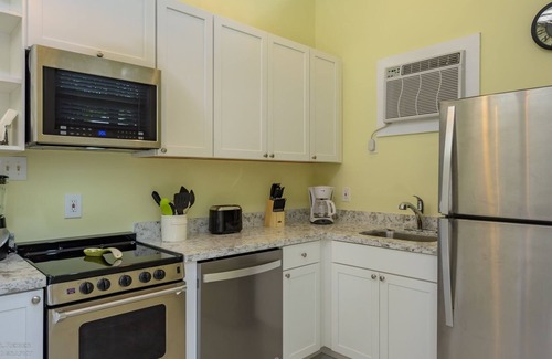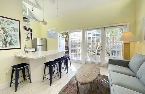 Tucked among a colony of freestanding Conch style cottages and lush tropical landscaping sits the newly renovated Hidden Oasis. Features of this property include a private bedroom with king bed, full kitchen, a living room with queen sleeper sofa, cable TV, gas BBQ grill, shaded private deck with outdoor dining, and a shared poolside patio, all at agreat nightly rate. This one-bedroom cottage is steps from the shared oasis-style, heated pool. It has been renovated with new floors and offers a kitchen with all new appliances. The kitchen has both a drip and a Keurig coffee maker. There is a washer and dryer in this rental and an outdoor shower on the private deck.