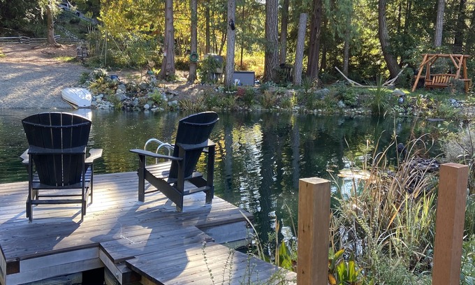 Located in Metchosin 30 minutes from Victoria and Sooke. The Hidden Pond spacious family suite is perfect for your family or group getaway or anyone looking for peace and tranquility. Two bedrooms include a large primary (King ) with futon coach and a bunkhouse room (two double and two single bunk beds) both with full ensuite bathrooms making this versatile space works for large families. Full kitchen with dishwasher, laundry, large living space with fireplace opens onto the large covered deck for all-season indoor and outdoor living and dining with spectacular pond and forest views. Hot tub, private beach, swimming pond, firepit, trails, and orchard on 10 private acres make this an oasis with so much to offer. This newly renovated suite can be booked to join with our Hidden Pond Gong Suite for a full property buy-out.