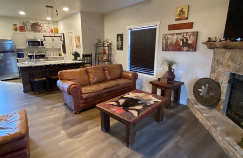 This cozy cabin is located in Sportsman World at Possum Kingdom Lake. This charming two-bedroom one bath has everything you need. The kitchen is fully equipped, the living room is comfy with a fireplace, each room has a smart tv, and outdoors features a relaxing patio with two fire pits. wake up to a cup of coffee, relax on the porch, and enjoy the wildlife. Minutes away from Bluff Creek marina which offers boat, kayak, paddleboard, and other rentals. The Hideout Cabin is where you want to be, and we look forward to hosting your stay.