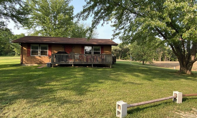 The Hide Away Retreat sleeps 6 people (3 people in NOVEMBER) with 2 bedrooms, living room pull out queen sofa bed and 1 full bathroom. The location is 300+/- yards from Rathbun Lake on a quiet dead end dirt road about 2.5 miles from paved road. It has a large, private back yard with openness and trees for family gatherings. There is a deck on the south side (front of home) and a fire pit on the north side (back of home). The views from this cottage are beautiful with a view of a filling pond and large field with visiting horses, deer, turkey, and other wildlife.