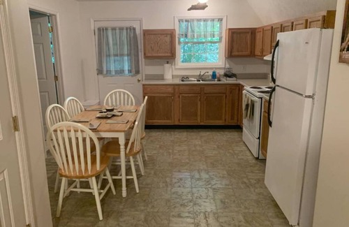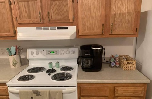 Our kitchen cabinets are stocked with essential cookware including pots, pans, dishes, glassware, silverware, baking sheets and dishes and more. Appliances include a fridge, oven and Keurig coffee maker that can make both single cups and a whole pot. The dining table in the kitchen seats 6.