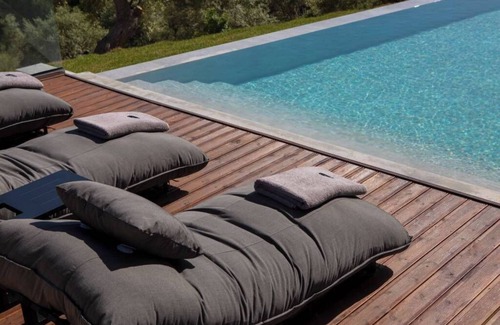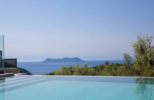 The exterior spaces are thoughtfully planned, and the exquisite infinity pool of approx. 45sqm stands out creating a balcony with unobstructed view from our olive grove up to Rouda golf while the horizon boundaries are lost around Arkoudi Island. A pergola covers the outdoor dining area offering shade from the revitalizing Mediterranean sun. The enchanting view makes the exterior part ideal for social gatherings.
