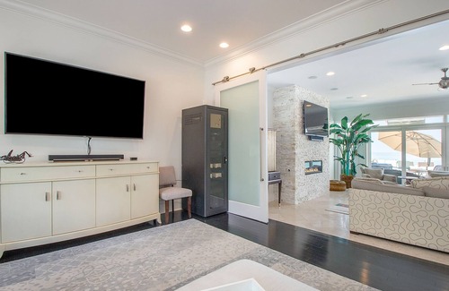The pool deck has a patio with a fireplace, outdoor television, and a seating area, along with a grilling area with additional seating and a double-wide Viking grill. A flight of well-kept stairs leads down to the lower level deck that is closer to lake level, with loungers for sunbathing and another fireplace to enjoy during cool evenings. Each deck has a space heater as well.