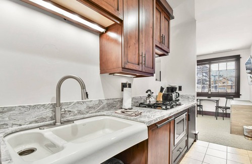 This charming space opens to a fully-equipped kitchen with granite countertops, a gas range, microwave, coffeemaker, and blender—everything guests need to stay fueled and refreshed. Beyond this is the spacious bedroom area with a comfortable king bed and 55” Roku TV. An intimate 2-person dining set overlooks the picture window with West-facing views of the mountains. End the day with a nightcap and watch the sunset over the slopes. The bathroom has a combination shower/bathtub with high-end finishes and a full-length mirror.