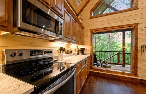 Just Sayin is a new luxury cabin perfect for couples or a small family. Unlike many this hidden gem is tucked away offering seclusion and privacy. The 14ft elevated front porch over looks an endless scenic view of rolling towering pines.