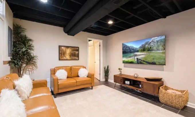 This home has a fully finished basement which includes a large living space with a 65 inch TV. The basement level also has a full bathroom as well as an additional bedroom with a full sized bed.
