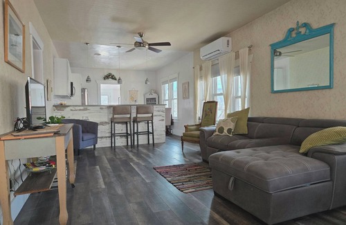 This charming 2 bedroom/2 bath bungalow features an open living area with a dedicated work space, fully equipped kitchen, laundry, a front & back porch, outdoor living & dining space, BBQ, A/C & Wifi.