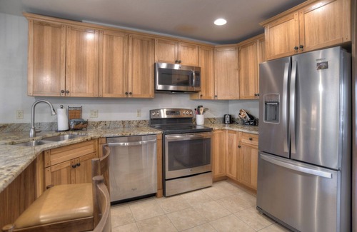 The upper-level loft includes a queen size bed, bunk beds, and a view of the open living room below. The private, primary bedroom is complete with a King Size bed, large walk-in closet, desk and a stackable washer/dryer combo. The spa-like beautifully remodeled bath offers a large walk-in shower. There is also a pack-n-play for families traveling with infants.