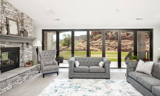 Experience the outdoors of Southern Utah. This home offers a private red-rock mountain in your backyard, ideal for exploration. The 21-foot movable wall offers an indoor/outdoor experience that connects you to the 1-acre backyard where you'll find a hot tub, large grass area, grill, and vast patio to enjoy. This 4 bedroom, 4 bathroom home offers a custom kitchen and open-living concept. Nearby access to trails for hiking. Close to Zion, Bryce Canyon, Lake Powell, and North Rim Grand Canyon.