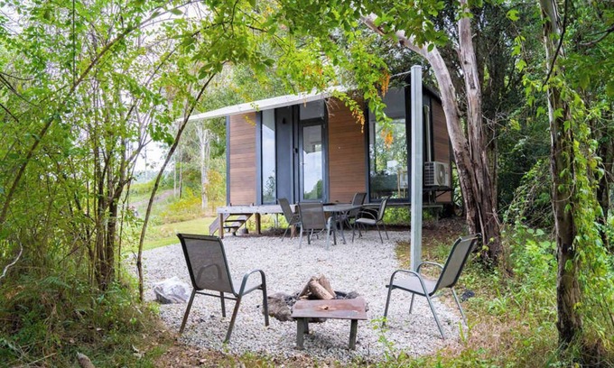 A cozy 139-square-foot tiny home with easy access to water, split air conditioning, a kitchenette, cooking equipment, and excellent bathroom facilities. These amenities include an eco-friendly compost toilet, hand basin, and shower (gas-heated for hot showers).