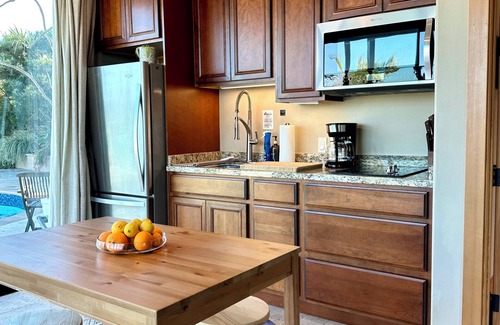 The pool house is equipped with indoor and outdoor showers, laundry, WiFi, split AC and heat system, full close privacy curtained and shades, fully equipped kitchenette and super comfy livingroom.
