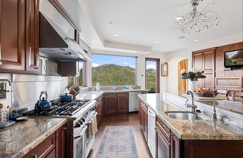 Step outside to a family paradise with an inviting infinity-edge pool(salt water pool) and spa. Note that the pool can be heated, as well, for an additional fee, providing a customized experience for your enjoyment. The fully equipped outdoor kitchen, grill, pizza oven, electric heaters, and outdoor TV create the perfect setting for family gatherings. Explore the koi pond, garden, and courtyard, offering idyllic spots to enjoy the sunset over the hills.
