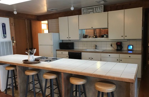 The kitchen, dining, and living area is an open concept space. The kitchen has a 13 ft island, full-size refrigerator, coffee maker, microwave, stove, and oven. The living room has a large dining room table that will seat 10, pool/ping pong table, couch and loveseat, and TV with Dish Network & Netflix.