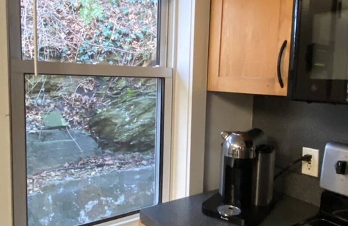 Inside is newly remodeled by an artist. Full kitchen with dishes and cooking pots and pans. Big screen tv in living room, flat screen tvs in both bedrooms, as well as electric fireplaces. New beds with adjustable headboards and luxury linens. Go right out to the patio from downstairs bedroom / bathroom suite. Upstairs bedroom has angled ceilings and a sitting area - you fell like you are in a treehouse! Walk across the catwalk to the boutique bathroom with soaking tub and sky mural. Free parking in driveway.