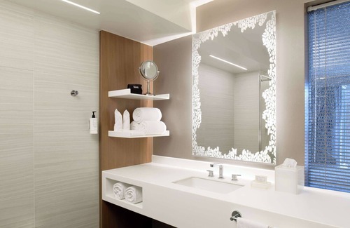 Hilton Washington DC National Mall The Wharf offers 367 accommodations with laptop-compatible safes and coffee/tea makers. Beds feature premium bedding. 65-inch flat-screen televisions come with premium cable channels, pay movies, and Netflix. Bathrooms include bathtubs or showers, designer toiletries, and complimentary toiletries.