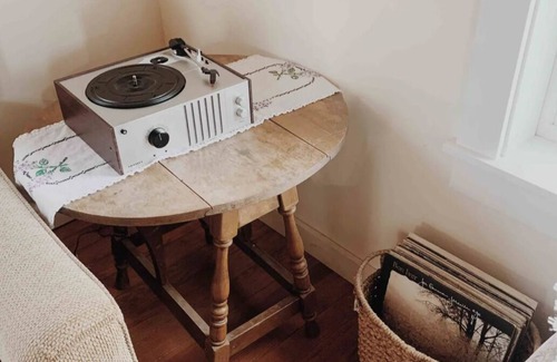 Living room: Roku SmartTV (we do not have cable) two sofas, dining nook, washer & dryer, original wood floors, a record player with vintage records, exposed original beams & vaulted ceiling.