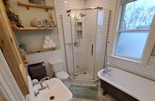 It is located on the main floor and features a beautiful claw foot soaker tub and glass shower.
