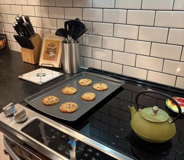 Food & DrinkChocolate/Cookies, Tea/Coffee maker, Bottle of waterBathroomBathtub or shower, Body soap, Towels, Walk-in shower, Shampoo, Hairdryer, Guest bathroom, Private bathroom, Toilet, Conditioner, Free toiletries, Toilet paper, Shower, BathtubMedia & TechnologyRadio, TV, Flat-screen TV, Streaming service (like Netflix)GeneralAir conditioning, Smoke Alarm, Heating, Fan, Hardwood or parquet floors, Carbon monoxide detector, Private entrance, Fire extinguisher, Iron, Trash cansKitchenOven, Dishwasher, Kitchen, Toaster, Washing machine, Wine glasses, Coffee machine, Microwave, Kitchenware, Dryer, Stovetop, Refrigerator, Cleaning products, Dining tableLiving AreaSitting area, Desk, Dining area, SofaOutdoorsPatio, Outdoor furnitureBedroomLinens, Walk-in closet, Wardrobe or closet, Childrens' cribsAccessibilityEntire unit located on ground floorBuilding CharacteristicsDetachedRoom AmenitiesNon-feather pillow, Socket near the bed, Clothes rackEntertainment & Family ServicesBoard games/puzzlesViewQuiet street viewCleanliness & disinfectionHand sanitizer |