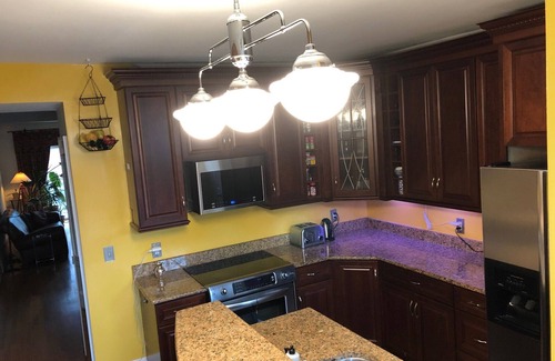 With open dining, living and outdoor space, this home features natural light, hardwood floors, clean decor, and all the necessities of home. The living room features a woodburning fireplace, leather furniture and television with digital antenna, Netflix, and Prime as well as WIFI.