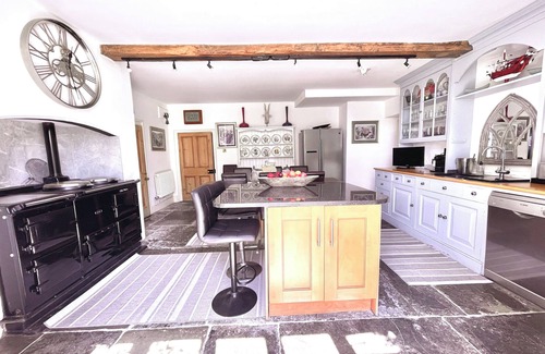 The three storey house is great for entertaining having a 30ft double reception room with two efficient wood-burners and separate dining room with an open fireplace that can seat at least 12. The kitchen/breakfast room comes with a traditional 4 door Aga. Upstairs there are 6 spacious double bedrooms. The master bedroom has a super king size bed and luxurious bathroom with twin sinks, bath and walk-in power shower. Bedroom 2 has a king size bed and ensuite shower room, bedroom 3 has twin beds and bedrooms 4 and 5 in the attic have queen size beds and a bathroom with twin sinks, bath with shower attachment, bedroom 6 is a double bedroom and also has its own bathroom.