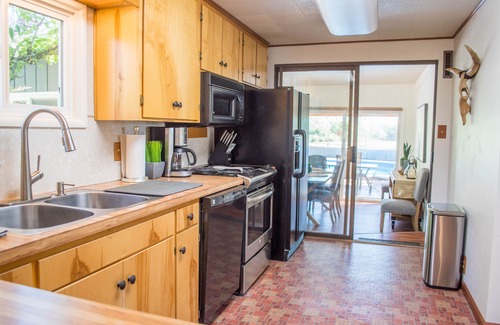 Entering the home you will find an open layout kitchen, dining area, and relaxing living room with fireplace. Our well stocked kitchen is perfect for all your cooking needs. We also provide complimentary coffee and tea, and laundry pods/dryer sheets in our laundry room.