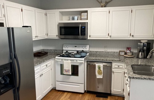 The kitchen, beautifully done with stone countertops, full-size working appliances, and everything you need to cook, and enjoy your meals.