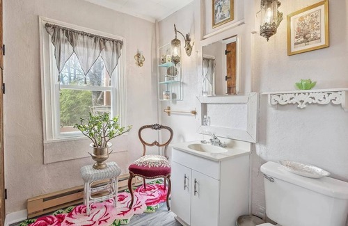 Upstairs brings a charming quirkiness: Bedrooms 1, 2 & 3; a reading nook filled with books galore, a 1/2 bathroom. Bedroom 1, the romantic room, enjoys direct access to the upstairs porch complete with 2 Adirondack chairs; sip your morning coffee whilst the sun rises or enjoy your evening cocktails with the setting sun.