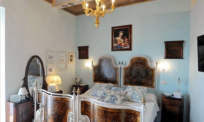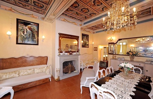 Historic house with high painted coffered ceilings, beautiful hand-painted doors, original furnishings from the beginning of the century, large living room with fireplace and 50-inch smart TV, 3 double bedrooms with memory mattresses and pillows, balconies with stunning views, 2 large bathrooms with comfortable showers and hairdryer, full kitchen with fridge, dishwasher, washing machine, espresso, microwave, dishes and cookware, table and iron, Wi-Fi, air conditioning. Nearby free parking, services and the main square