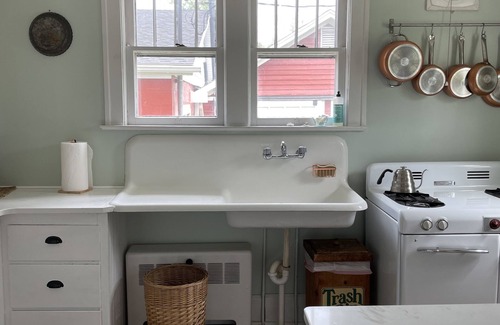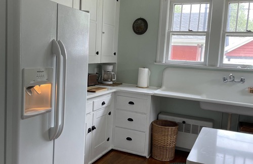 The kitchen is fully equipped with ample cookware, dishes and cutlery. It is stocked with glassware and barware, and even melamine dishes for outdoor use. There is an antique farmers sink and gas stove, as well as a dishwasher, side by side refrigerator, microwave, coffee pot, and toaster. You will also find a coffee and tea set up for our enjoyment during your stay.
