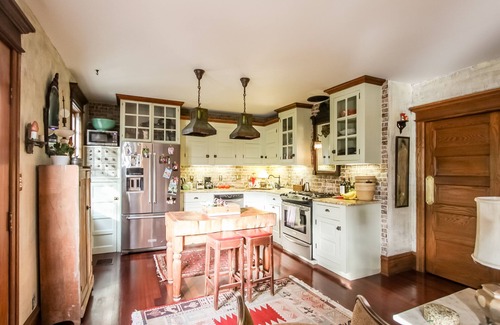 Sleeping arrangements: 2 Queen size beds (1 memory foam for the firmer sleeper and 1 plush) in the 1st & 2nd bedrooms and the 3rd (a tiny sized) bedroom off the kitchen has a full size loft style bed with twin underneath which can be enjoyed by 2 children/teens/young adults as a super unique sleeping area. There's also a Queen sleeper sofa in the front living room. Stepping outside, the 1800's era hand-carved wooden French doors from the kitchen lead to an expansive brick patio with a spacious 37'x13' in-ground pool, stainless steel BBQ grill, lounge chairs, 2nd large dining table, enclosed outdoor shower and mature, well maintained plantings throughout.