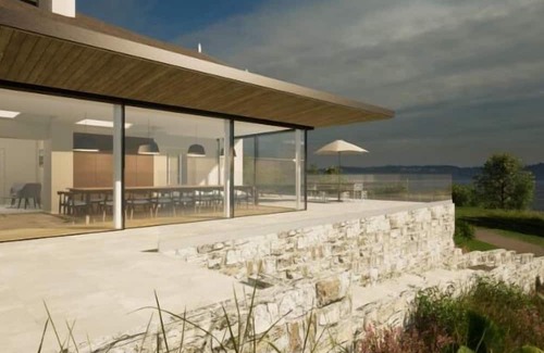 The home also offers a stunning outdoor living space. The dining area, with its retractable wall-to-ceiling windows, extends to a patio and terrace that overlooks the sprawling gardens and offers uninterrupted views of the Menai Straits. The garden area provides an ideal setting for outdoor dining and relaxation.