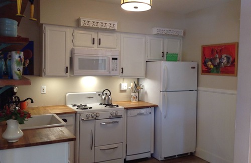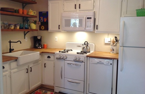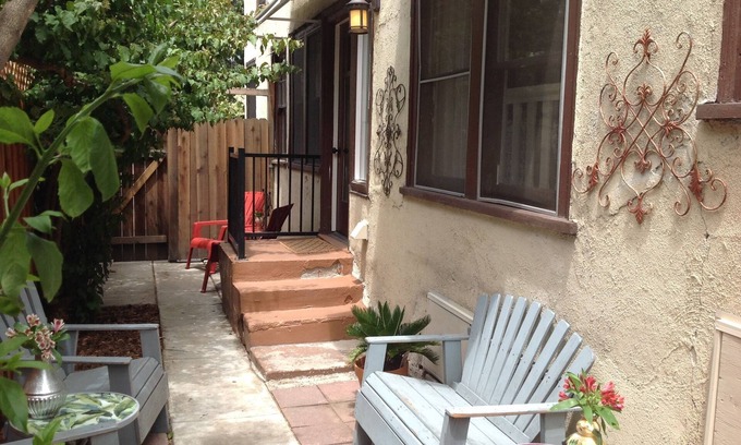 Impeccably maintained 100 year old Spanish architecture host this 2 bedroom located in Prime Silver Lake. Newly remodeled Kitchen with butcher block counters, open shelving and a farm house sink. Origingal hardwood floors throughout. Beautiful french wood windows and doors. Full bath with tub that has a hand held shower fixture as well as standard shower fixture. 2 beautiful bedrooms. Private courtyard with seating, alfresco dining and cafe lights. Walk to Sunset Blvd and everything it has to offer, or walk around the Lake all from your front door step. This is a very spacious bungalow. All of the comforts of home while staying in a historic old building.