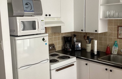 The kitchen is equipped with an oven, a stovetop, and a refrigerator, as well as a coffee maker, an electric kettle, and a lobster pot. Bathroom amenities include a hair dryer, towels, and toilet paper. And there's access to laundry facilities, so you can even pack a bit lighter. Other amenities include bed sheets, an ironing board, and heating.