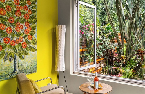 Through the entertainer's kitchen, the sunroom's view of the garden makes it the perfect spot for a lazy brunch - or unwind with sunset cocktails at the end of a long day of sightseeing. In the adjoining bathroom, follow up with a blissful soak in the stone-lined half-sunken bathtub - its custom-built for 2! Double showers are also a feature.