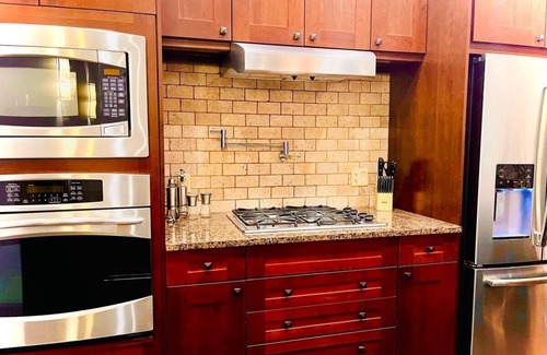 In this beautifully newly furnished and recently renovated condo, you will find a large kitchen, 3 bedrooms, and 2 full bathrooms each with heated floors. The large master boasts a 4 piece ensuite (large soaker tub with separate rain shower), a king bed with a large closet, a smart TV, a set of drawers, and a view of the courtyard. The second bedroom is equipped with a queen bed, drawers, and closet. In the third bedroom, you will find a bunk bed that is accessible on the bottom from both sides, the bunk bed has a queen on the bottom and a double xl on the top. There is also a closet in the third bedroom. Down the hall, you will find a laundry room with a stacking washer and dryer and a boot/mitt dryer. In the open-concept living room, there is a large sectional, a love seat, and two swivel-high back chairs. There is a large table to seat all 8 guests. In the kitchen, you will find a wine fridge, two drink drawers, a dishwasher, a wall microwave, an electric wall oven, a proofing drawer, a gas range with a pot filler, and a French-door refrigerator with a water dispenser and ice maker. This condo is bright open and inviting.